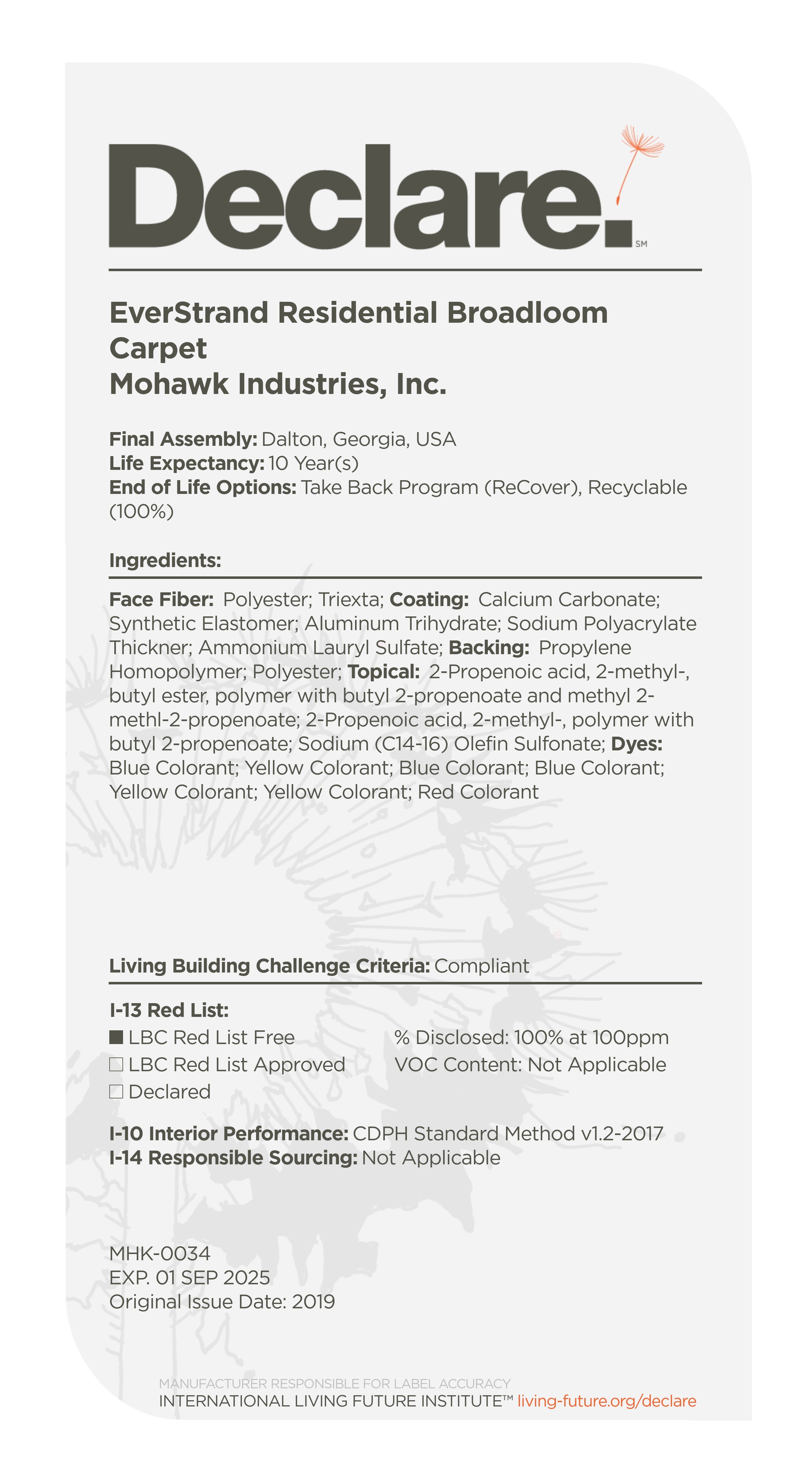 EverStrand Residential Broadloom CarpetEverStrand contains a minimum of 50% plastic post-consumer recycled content that was diverted from landfills, waterways, and oceans. The product is Red List Free, CDPH Compliant, and is disclosed through its self-declared HPD and DECLARE label. It is also 100% recyclable and is part of Mohawk's take back program. CategoryTufted Carpet Tile, SyntheticManufacturerMohawk![]() Material composition*Face: Polyethylene Terephthalate (PET) 50-55%; Coating: Limestone (Calcium Carbonate) 30-35%, Ammonium Lauryl Sulfate 0.01-0.10%, Magnesium Carbonate impurity; Primary Backing: Propene, Homopolymer, Isotactic (Propylene Homopolymer) 2-5%; Secondary Backing: Propene, Homopolymer, Isotactic 2-5%, Polyethylene Terephthalate (PET) (Polyester) 2-5%; Dyes and Pigments: C.I. Disperse Yellow 64 0-0.10%, 9,10-Anthracedione, 1.5-Diaminichloro-4,8-Dihydroxy 0.00-0.10%, C.I. Disperse Blue 60 0-0.10%, 3-Pyridinecarbonitriles, 5-[(4-Chloro-2-Nitrophenyl) Azo]-1-Ethyl-1,2-Dihydro- ID: 70528-90-4 6-Hydroxy-4-Methyl-2-Oxo 0-0.10%, C.I. 10338 0-0.10%, C.I. Disperse Red 60 0-0.10%; Topical: 2-Propenoic Acid, 2-Methyl-, Butyl Ester, Polymer with Butyl 2-Propenoate and Methyl 2-Methyl-2-Propenoate 0-1%, 2-Propenoic Acid, 2-Methyl-, Polymer with Butyl 2-Propenoate 0-1%, Alkenes, C14-16 Alpha-, Sulfanated, Sodium Salts 0-1% *as reported by the manufacturer AVAILABLE SIZING12' Wide, Roll COLORSA wide range of colorways CERTIFICATIONS & DISCLOSURES