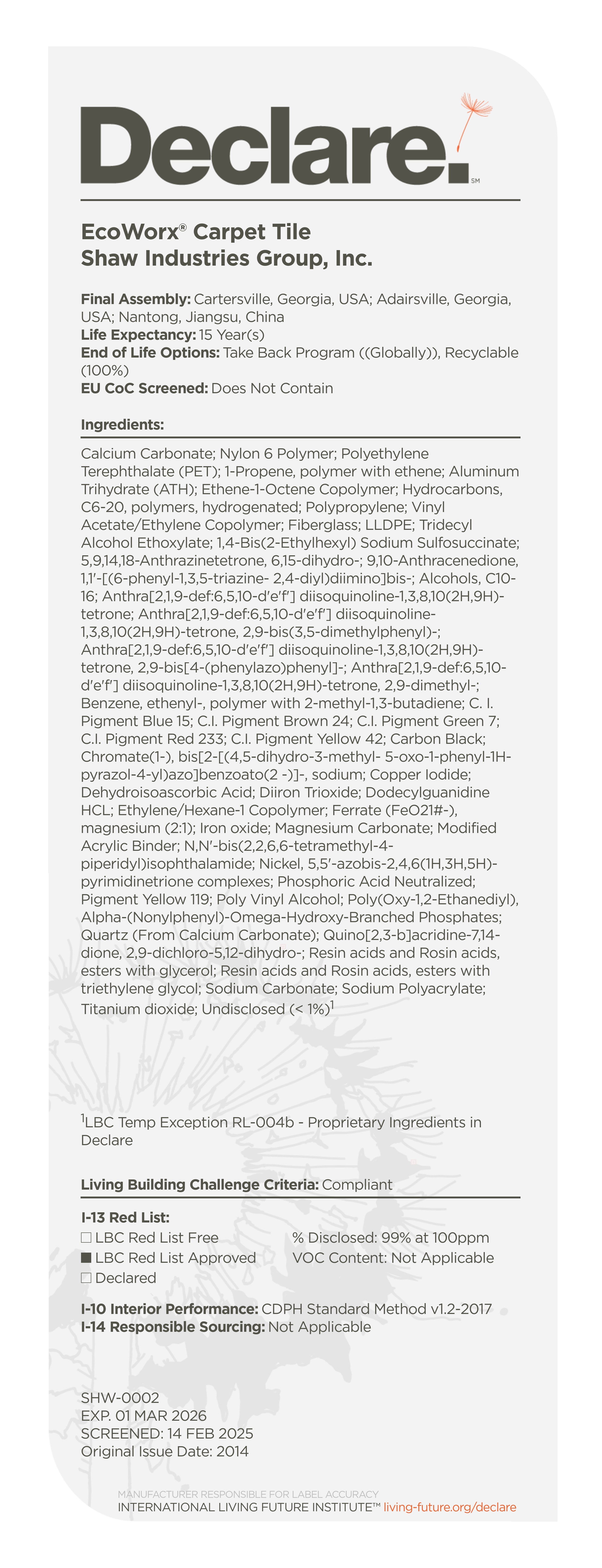 Ecoworx Carpet TileAvailable At the Donghia Materials LibraryShaw's EcoWorx carpet tile is a non-PVC backed carpet tile. Per manufacturer, all EcoWorx carpet tile with nylon are Cradle to Cradle Certified® Silver. The HPD relates to several EcoWorx products, including Truism, Adage and Belief Ecoworx tiles. They meet the Green Label Plus certification for low VOCS and contribute to LEED credits. EcoWorx contains 25% pre-consumer recycled content. Shaw guarantees free reclamation and recycling at the end of use. CategoryTufted Broadloom Carpet, SyntheticManufacturerShaw Contract![]() Material composition*Calcium Carbonate 22-58%, Ethene-1-Octene Copolymer 5-15%, Aluminum Trihydrate (ATH) 3-8%, Hydrocarbons C6-20 2-5%, Polyethylene Terephthalate (PET) 2-5%, Vinyl Acetate/Ethylene Copolymer 2-5%, Fiberglass 1-3%, Quartz 0.5-5%, Ethylene/Hexane-1Copolymer .1-2%, Nylon 6 Polymer 0-51%, Nylon 6.6 0-50%, Modified Acrylic Binder 0-1%, Polyvinyl Alcohol 0-1%, Resin Acids/Rosin Acids, Esters with Triethylene Glycol 0-1%, Tridecyl Alcohol Ethoxylate 0-1%, Undisclosed 0-1% *as reported by the manufacturer AVAILABLE SIZING18 x 36in CERTIFICATIONS & DISCLOSURES