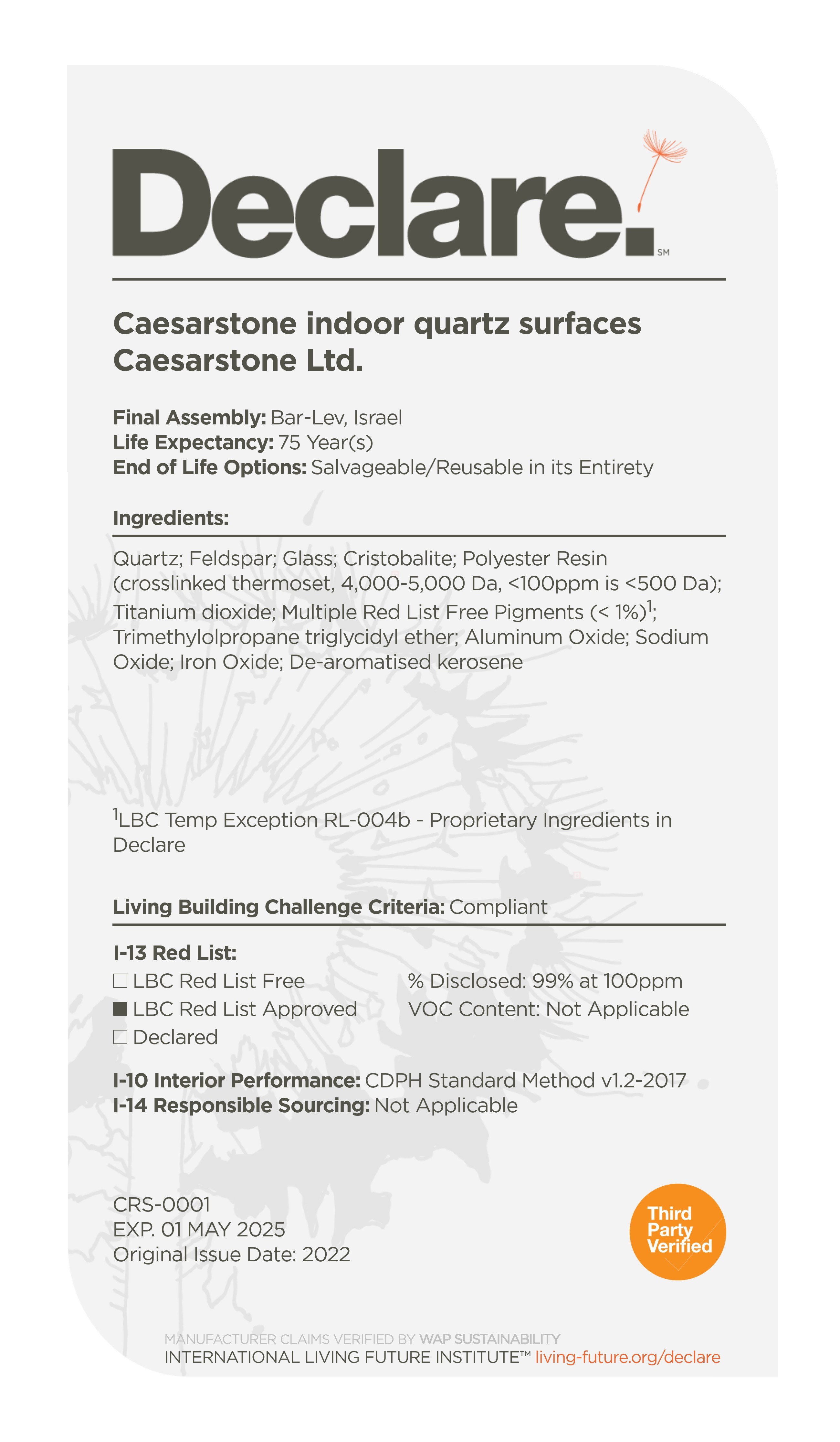 Quartz Classic CollectionUsed in Healthier Affordable HousingAvailable At the Donghia Materials LibraryCaesarstone's premium quartz can be used in both commercial and residential projects. Quartz provides a durable, low-maintenance surface for kitchens and bathrooms. This product also is Greenguard Gold Certified. CategoryDimensional Surface, Engineered StoneManufacturerCaesarstone![]() Material composition*Crystalline Silica and other natural Stone <85%, Cristobalite <50%, Polymeric Resin 7-15%, Additives 0-8% *as reported by the manufacturer AVAILABLE SIZINGCustom Sizes - available in 3/4” or 1-1/4” thickness COLORSAvailable in a variety of colors CERTIFICATIONS & DISCLOSURES