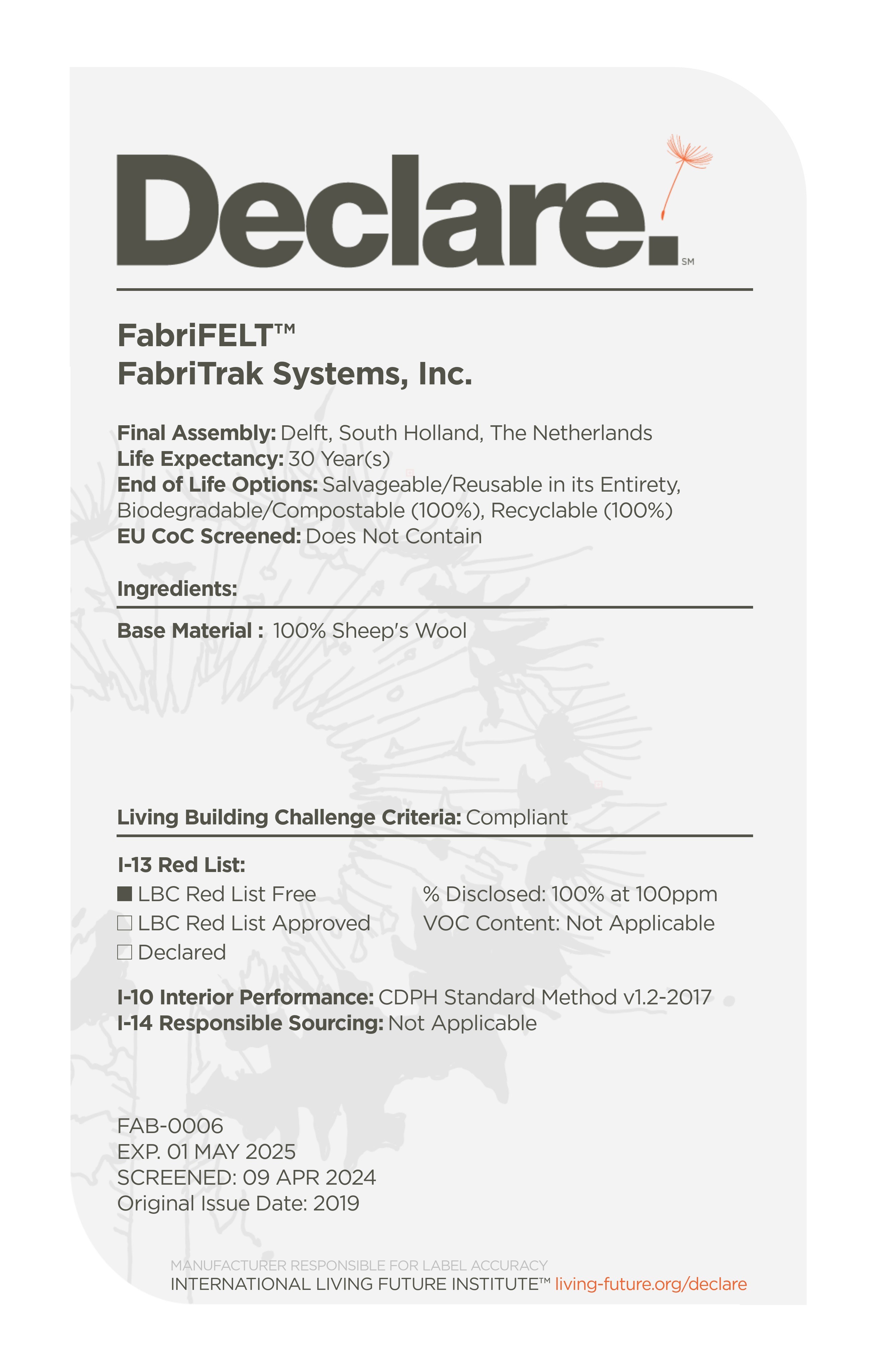 FabriFELT™Available At the Donghia Materials LibraryFabriFELT™ is made entirely from sheep's wool. The material is suitable for walls and ceilings, and contributes to sound absorption. FabriFELT™ is disclosed through its DECLARE label. The product is Red List Free, suitable for LEED v4 projects. As a natural material, felt can be recycled: the manufacturer will take it back for recycling or via general textile recycling pathways. CategoryTextile, WoolManufacturerFabriTRAK![]() Material composition*100% Sheep's Wool *as reported by the manufacturer COLORS23 Colors CERTIFICATIONS & DISCLOSURES