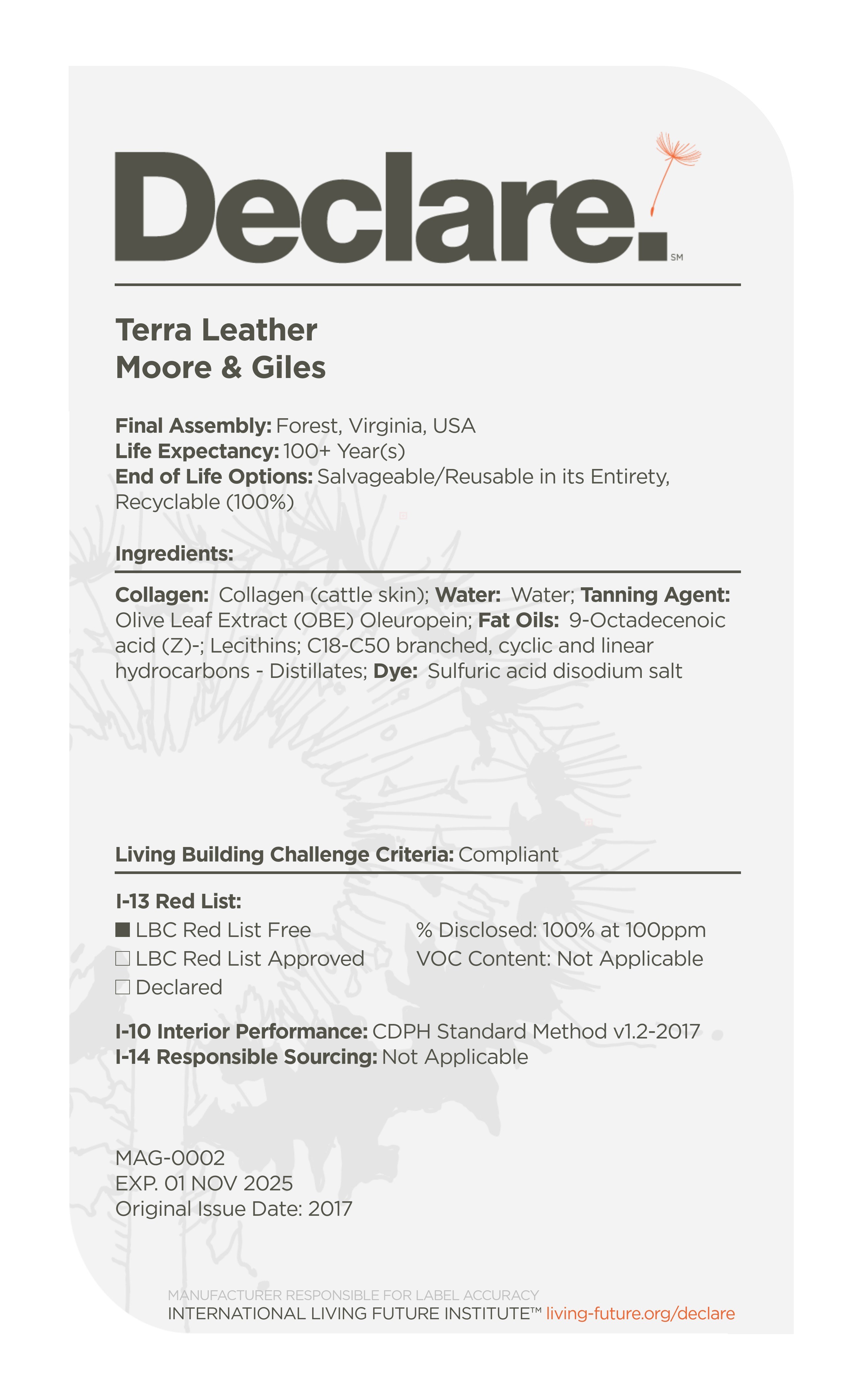 Terra Olive GreenAvailable At the Donghia Materials LibraryMoore & Giles’ Olive Green Leathers are aniline and crafted with wet-green® organic tanning agents. The dye is made from pure olive leaf extract which is a byproduct from olive production where these leave would traditionally be burned. The product is LBC Red List Free. CategoryTextile / Leather, BovineManufacturerMoore and Giles![]() Material composition*Collagen ( Animal Skin), Water, Olive Leaf Extract (Oleuropein) Tanning Agent, Fat Oils: 9-Octadecenoic acid, Lecithins, C18-C50 branched cyclic and linear hydrocarbons- distillates, Dye: Sulfuric acid disodium salt *as reported by the manufacturer COLORSavailable in various colors CERTIFICATIONS & DISCLOSURES