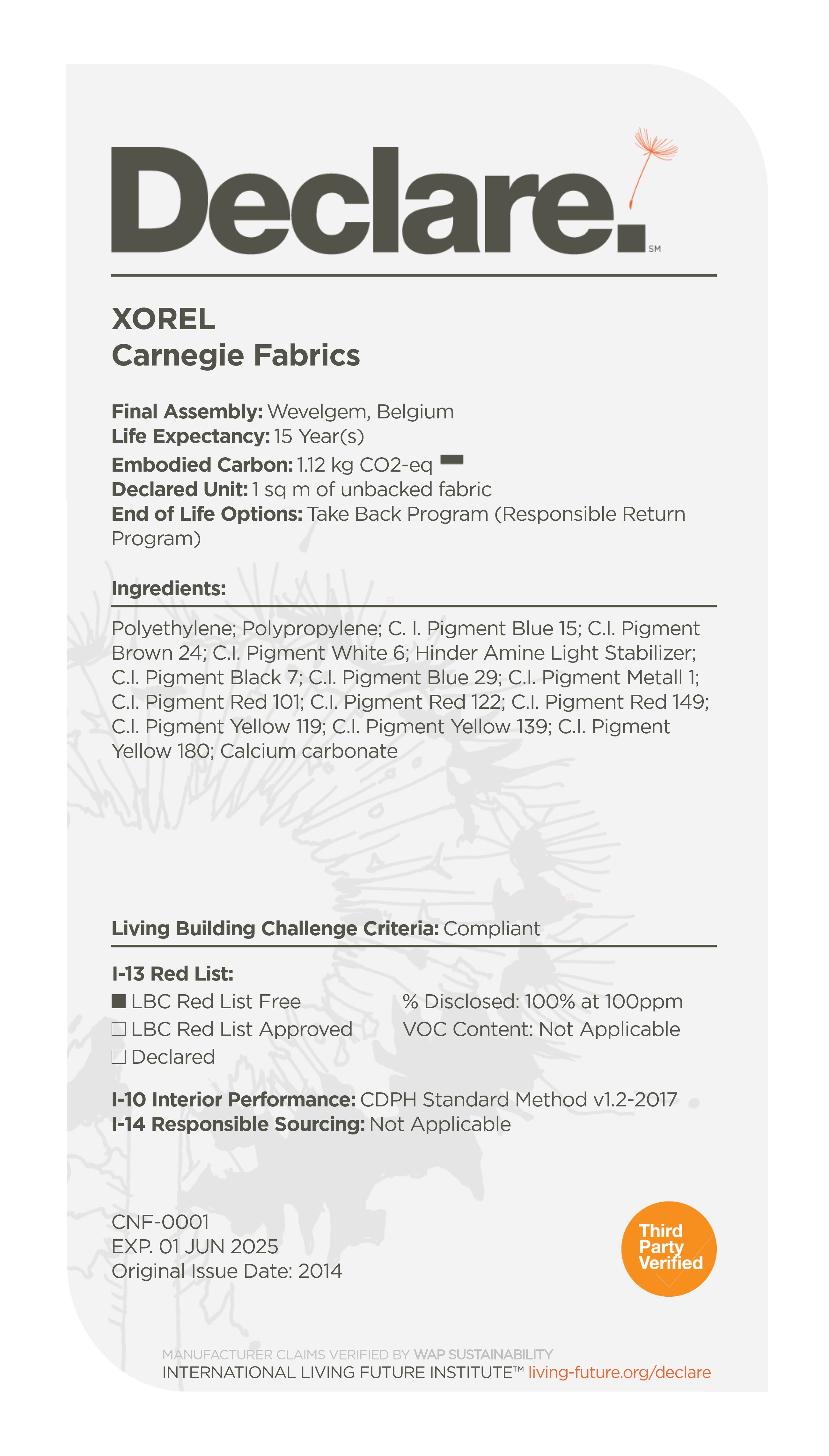 Biobased XorelAvailable At the Donghia Materials LibraryCarnegie's Biobased Xorel is a textile made from biobased polyethylene and polyproplyene. The fibers are derived from sugarcane, a crop showing carbon sequestration abilities. The textiles are not treated with perfluorinated chemicals or antimicrobials and have received C2C Gold certification - additionally, Carnegie offers a takeback program. It contains 89% Biobased Content and has been awarded the USDA Certified Biobased Product Label in the BioPreferred® Program. Note: the CASNR does not distinguish between a petrochemical or biobased polyethylene and so will show the same number - the HPDC document helps you identify the source. Abrasion: 50,000-100,000 double rubs CategoryTextile, BiobasedManufacturerCarnegie![]() Material composition*Biobased Polyethylene 95%-100%, Polypropylene 5%, Antimony Trioxide 1-2% Calcium Carbonate, C.I. Pigment Blue 15, C.I. Pigment Brown 24, C.I. Pigment White 6, Hinder Amine Light Stabilizer, C.I. Pigment Yellow 139, C.I. Pigment Metall 1, C.I. Pigment Red 149, C.I. Pigment Yellow 180, C.I. Pigment Blue 29, C.I. Pigment Yellow 119, , C.I. Pigment Black 7, C.I. Pigment Red 101, C.I. Pigment Red 122, 1,3-PROPANEDIAMINE, N1,N1'-1,2-ETHANEDIYLBIS-, POLYMER WITH 2,4,6-TRICHLORO-1,3,5-TRIAZINE, REACTION PRODUCTS WITH N-BUTYL-2,2,6,6-TETRAMETHYL-4-PIPERIDINAMINE 0-1% *as reported by the manufacturer AVAILABLE SIZING56" (142 cm) wide COLORSVaries CERTIFICATIONS & DISCLOSURES