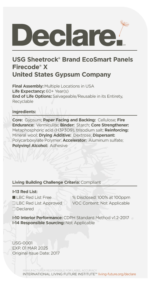 Sheetrock® Brand EcoSmart Panels Firecode® XLow-Embodied Carbon MaterialThis lightweight wallboard is Red List Free and GreenGuard Gold Certified, indicating low VOCs. Instead gypsum and vermiculite are used for their fire retardant properties. This product's HPD does acknowledge inclusion of a formaldehyde polymer as a dispersent (0.0000 - 0.0600%), accoding to USG replacment with an alternative is in process. HML will monitor this product for updated ingredients that do not include the formaldehyde polymer Polyvinyl alcohol (PVA, often used as the casing used in laundry and dishwasher detergent pods) is used as an adhesive. While this plastic is generally considered to be biodegradable, research shows that this may not be fully true. PVA can derive from bioethenol, but it is often produced using ethylene, a typical component of plastics. Per USG's product-specific EPD, this product meets HML's criteria for low embodied carbon. CategoryDrywall, GypsumManufacturerUSG Sheetrock![]() Material composition*Gypsum, cellulose, vermiculte, starch, metaphosphoric acid (H3P309), trisodium salt, mineral wool, dextrose, polycarboxylate polymer, aluminum sulfate, polyvinyl alcohol *as reported by the manufacturer AVAILABLE SIZINGThickness: 5/8 in. (15.9 mm) Width: 48 in., 54 in. CERTIFICATIONS & DISCLOSURES