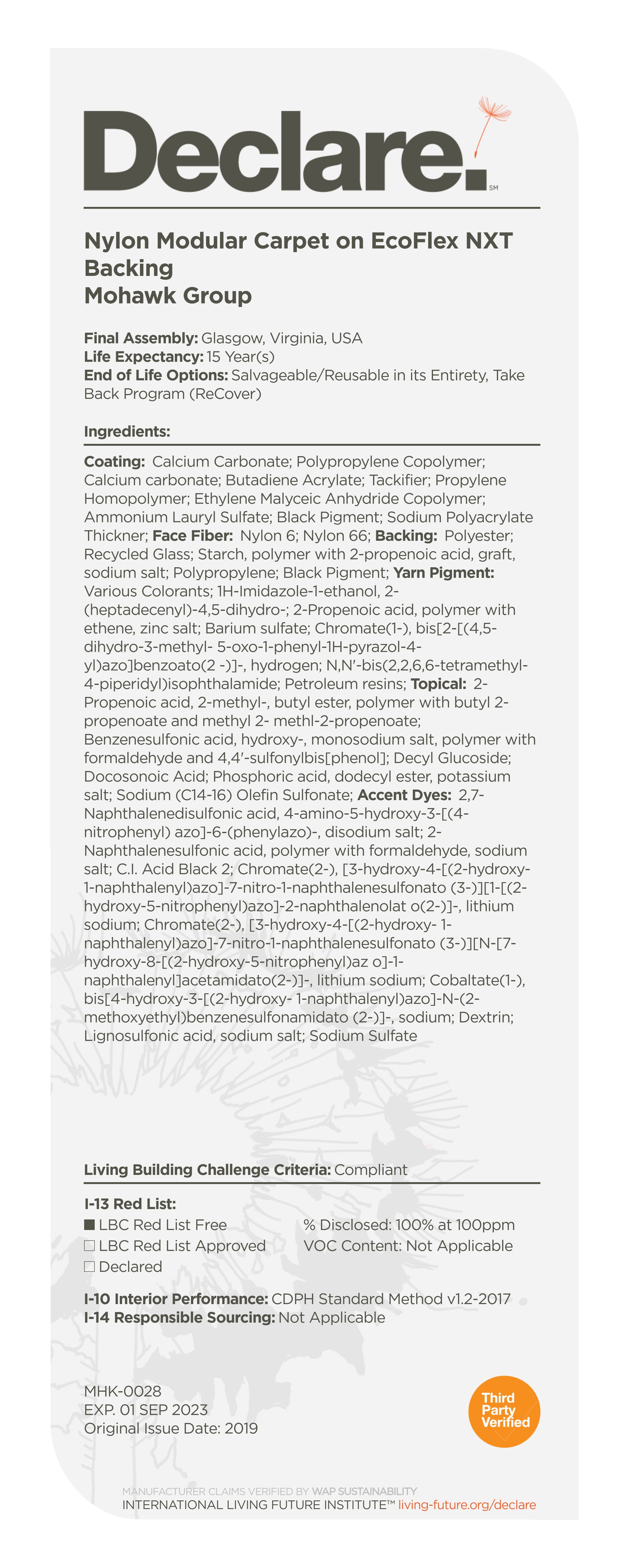 Nylon Modular Carpet Tiles on EcoFlex NXTMohawk's EcoFlex NXT Modular Carpet Tiles are Living Building Challenge Red-List Free. One of the company's product lines with this composition, the Lichen Collection, is the first flooring product to achieve the International Living Future Institute’s Living Product Challenge Petal Certification. Additionally, this product is designed to be installed using Mohawk's FlexLok tabs, the only red-list free carpet installation system on the market. These carpet tiles have a composite construction of a tufted